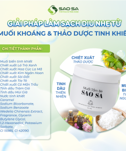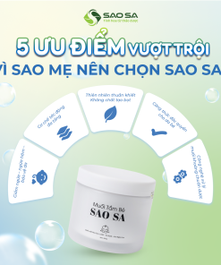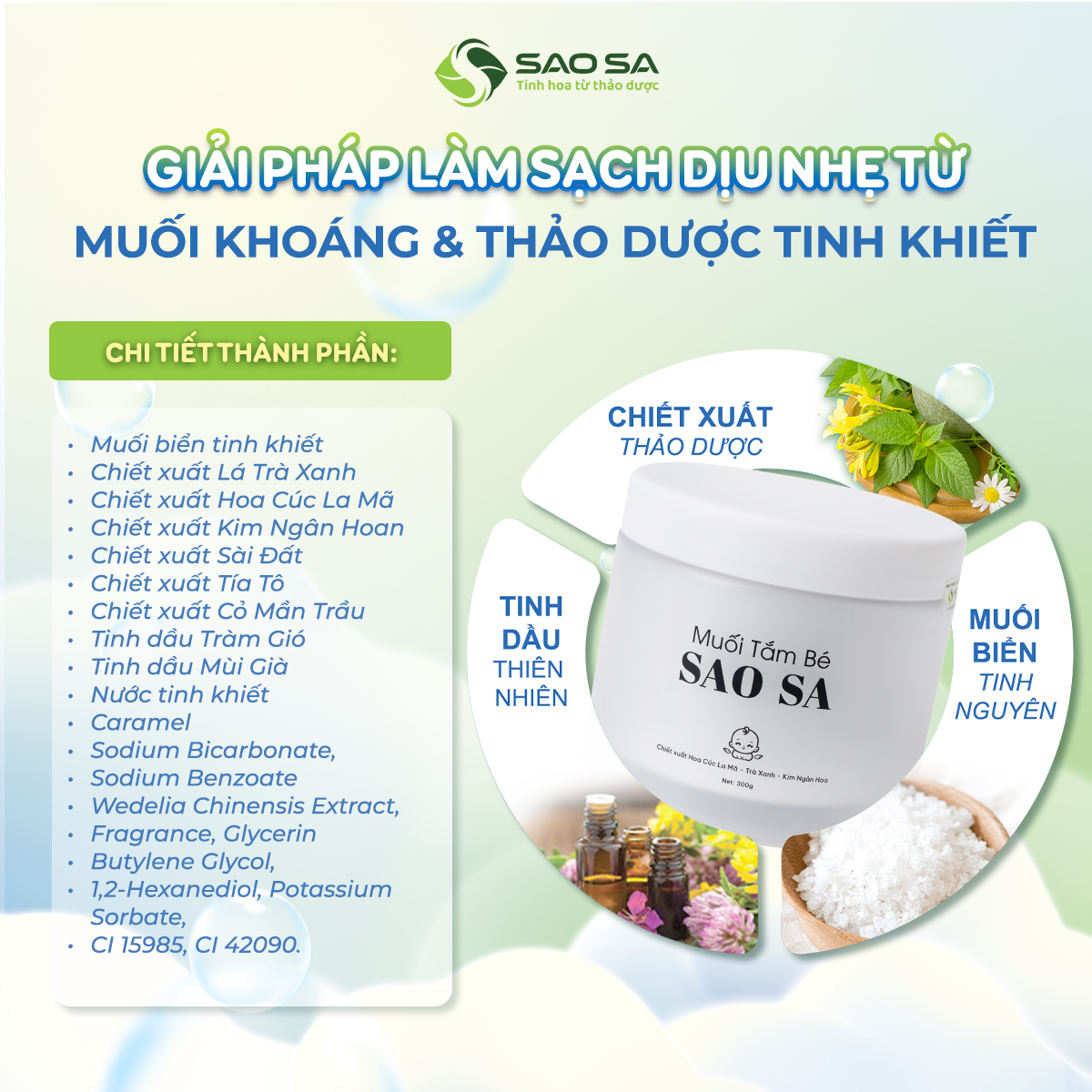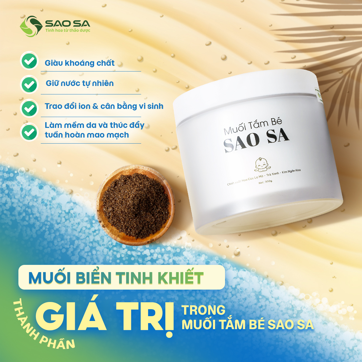 Là sản phẩm muối tắm dành cho bé, mang thương hiệu Sao Sa, được tinh chế từ muối tự nhiên và tinh thảo dược – giúp làm sạch da, diệt khuẩn, hỗ trợ phòng ngừa và điều trị các chứng rôm sảy, mẩn ngứa, hăm tã, hăm da…