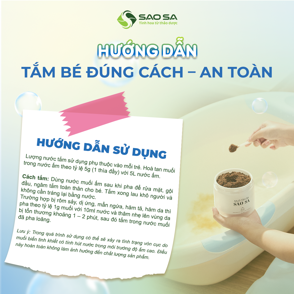 CÁCH DÙNG: Lượng nước tắm sử dụng phụ thuộc vào mỗi trẻ. Hoà tan muối trong nước ấm theo tỷ lệ 5g (1 thìa đầy) với 5L nước ấm.