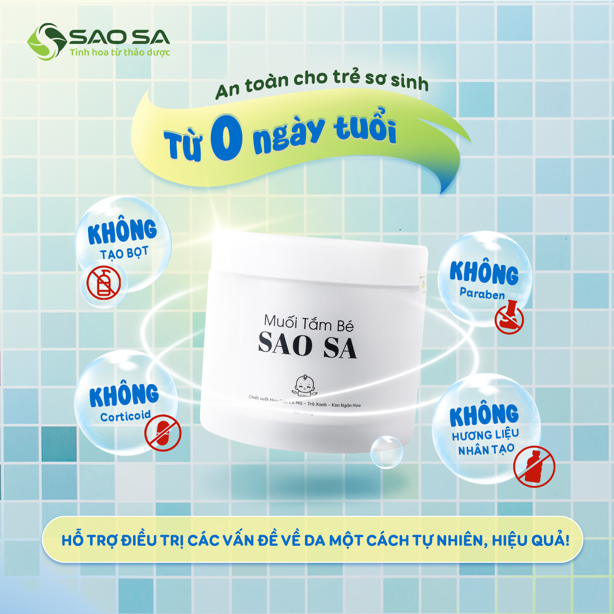 Là sản phẩm muối tắm dành cho bé, mang thương hiệu Sao Sa, được tinh chế từ muối tự nhiên và tinh thảo dược – giúp làm sạch da, diệt khuẩn, hỗ trợ phòng ngừa và điều trị các chứng rôm sảy, mẩn ngứa, hăm tã, hăm da…