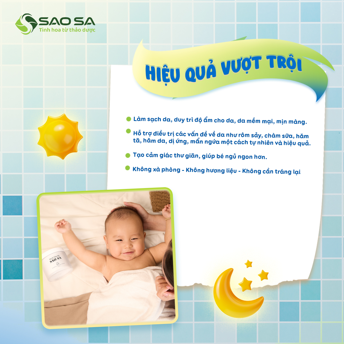 Sao Sa chỉ nghĩ đến những làn da bé chưa sạch, dễ bị nhạy cảm, dễ nổi mẩn đỏ, hay bị rôm sảy… và cả những lần mẹ lo lắng nhìn con khó chịu, quấy khóc chỉ vì ngứa ngáy.